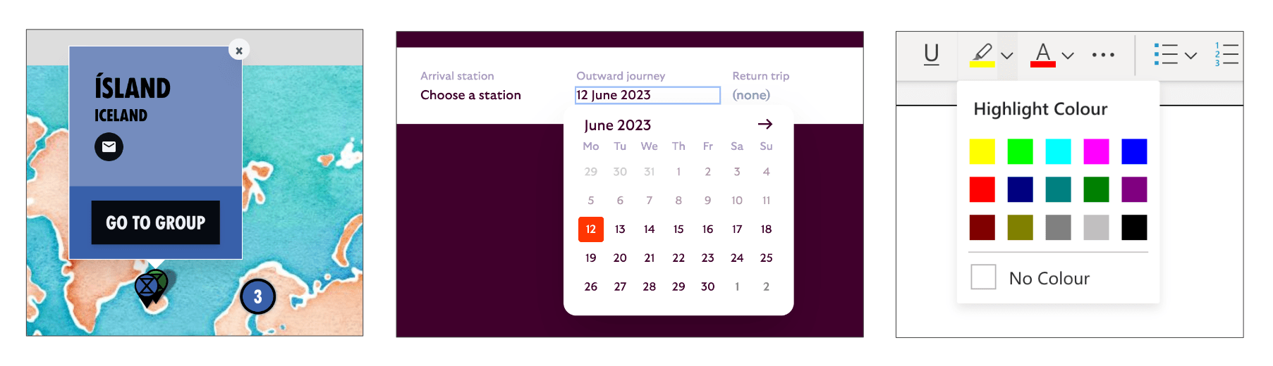 Examples of anchored popovers: map toggletip (Extinction Rebellion), date picker (European Sleeper), colour picker (Microsoft Word web app)